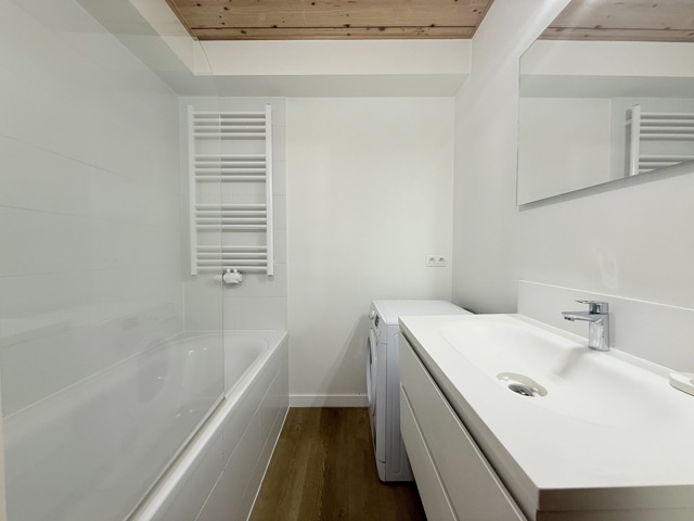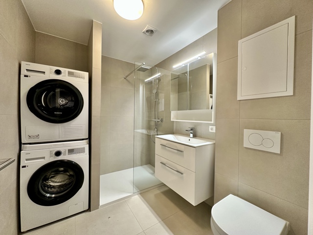 Salle de douche moderne avec machine à laver et séchoir inclus
