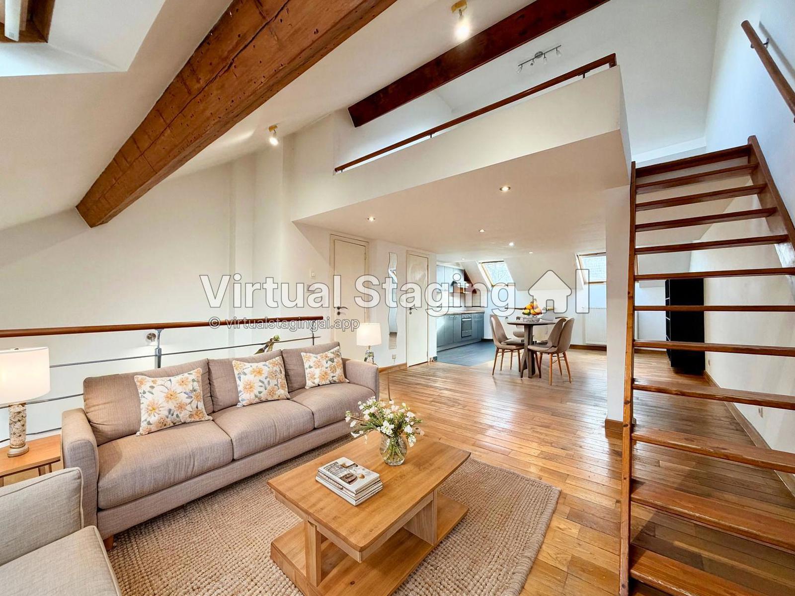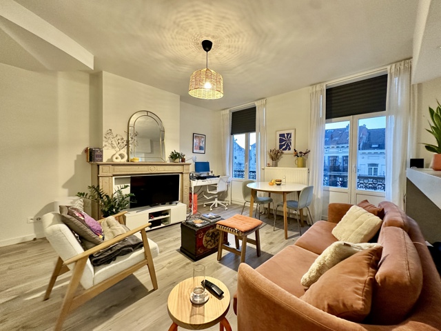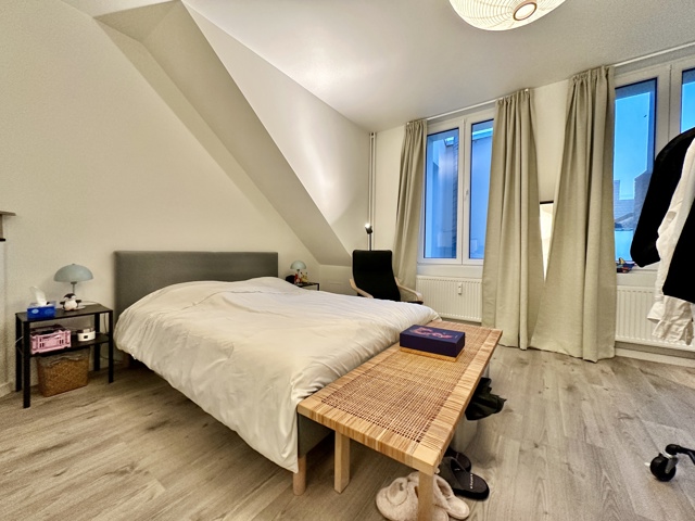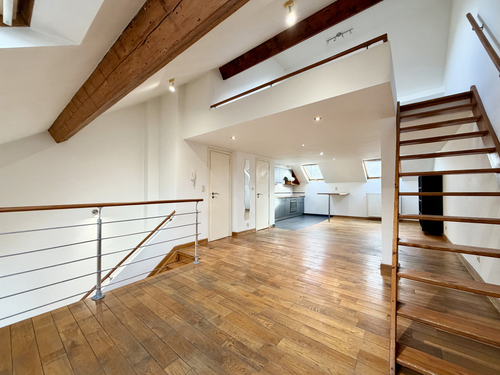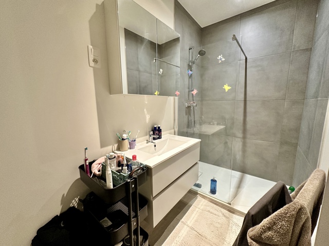 Deux chambres de ± 14 et 16m² avec dressing (un double lit et deux simples lits), un bureau de ±10m² avec un canapé-lit, Une salle de bains avec machine à lavée et sèche-linge. Un vestiaire, un WC, un hall d’entrée de ±7m². Cave.PEB E - Charges provisoires : 250€ ( Les communs, le chauffage, l'eau)