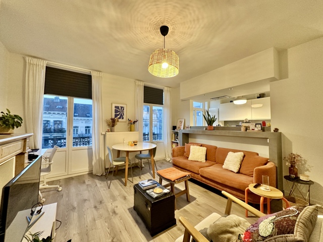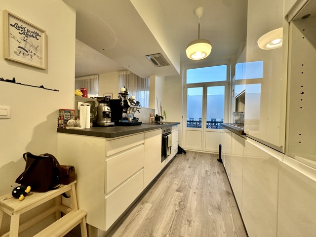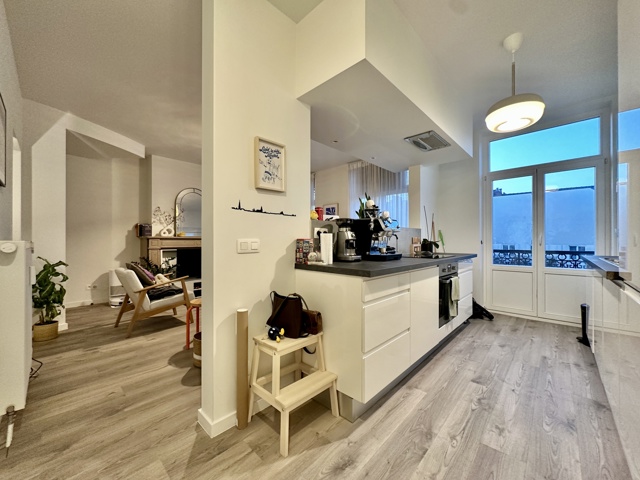 Cet appartement est muni d’un salon de ±40m², une salle à manger, cuisine ouverte super équipée (frigo, four, taques, micro-ondes, lave-vaisselle).