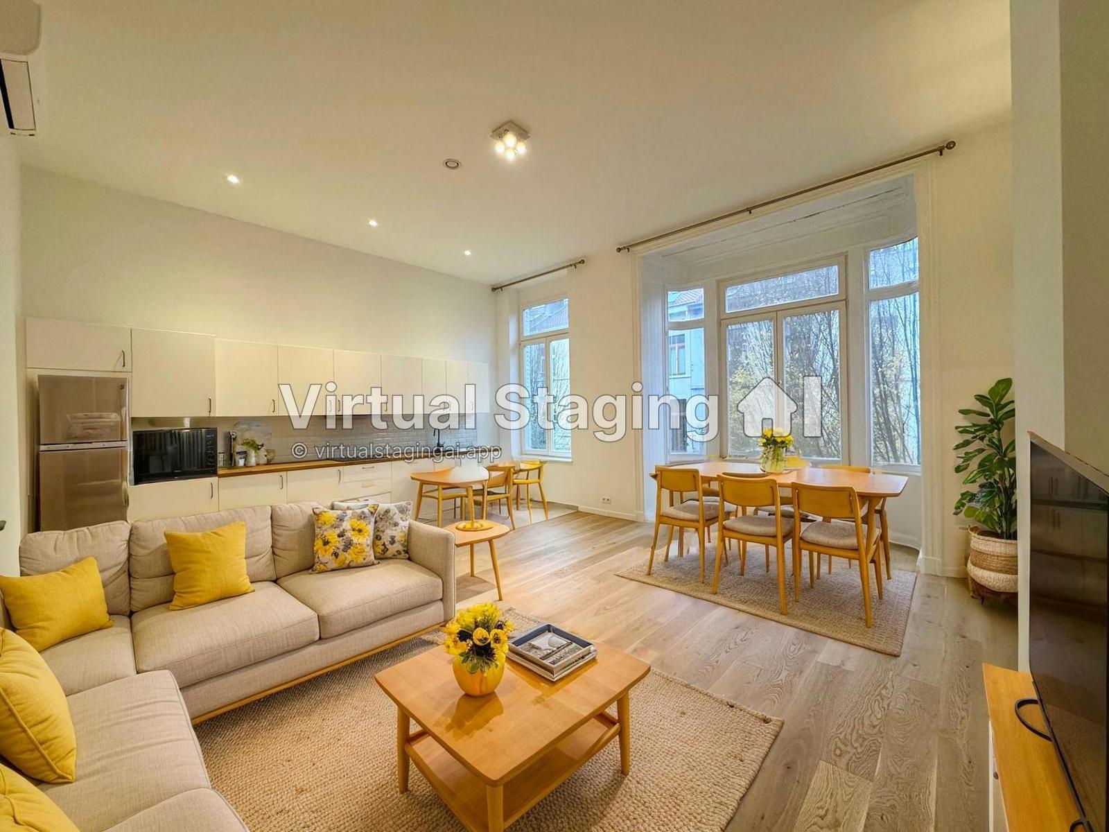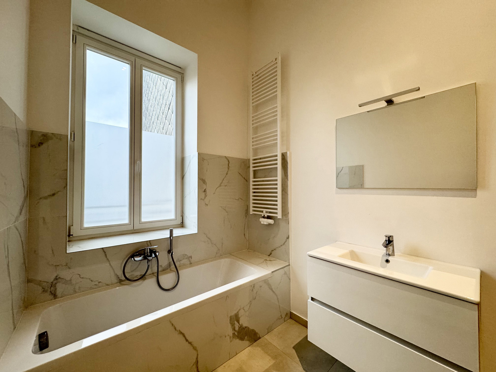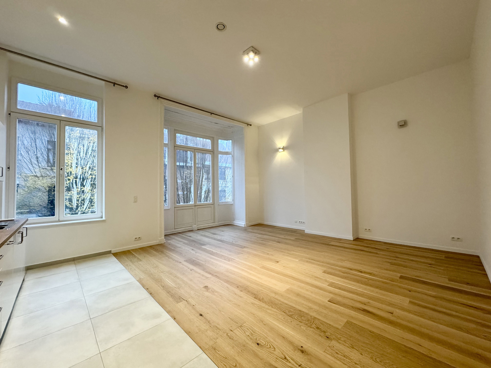 ! NEW ! SQUARE AMBIORIX - Abita offers you an exclusive 96m² 1-bedroom duplex apartment ENTIRELY RENOVATED in 2024 in a beautiful, well-maintained building - The apartment comprises 1 large 25m² bedroom with en suite bathroom (bath + shower + washing machine area), separate toilet, bright 45m² living and dining room with super-equipped kitchen (dishwasher, oven, hob, fridge-freezer), north-west-facing terrace to the rear in a quiet location, cellar and bike room. Communal charges of 150€/month (building services, communal cleaning, management fees, building fire insurance and communal electricity). Water, electricity and gas to be paid privately. PEB D. Not furnished.